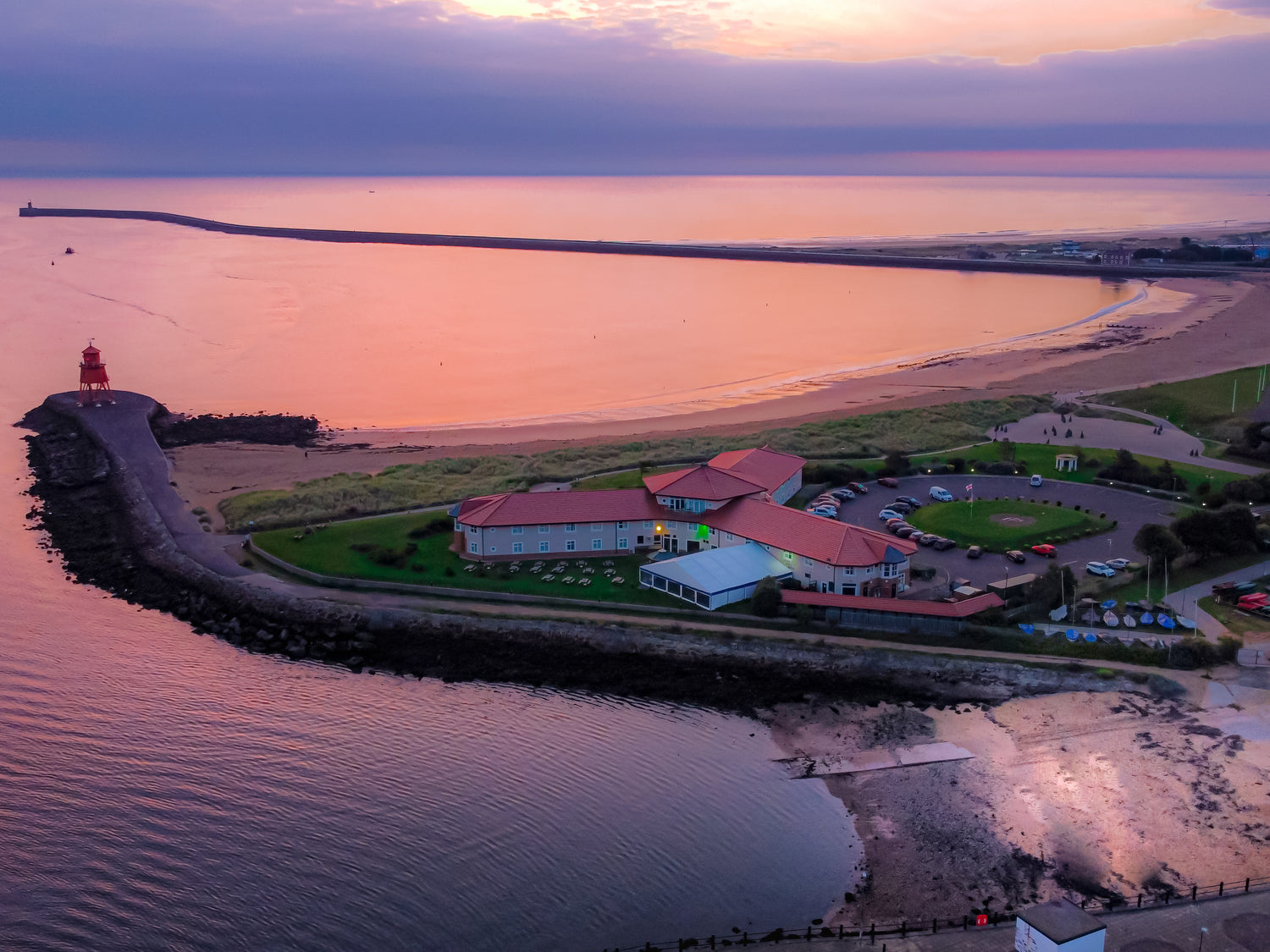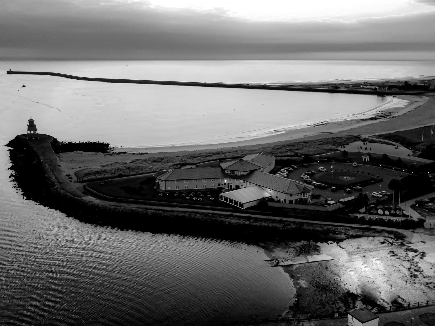 Drone shot over the south pier, Herd Groyne and Little Haven beach